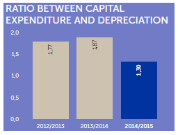 The quality of Manufactured Capital will decrease if net investment is not positive. When capital expenditure is higher than depreciation, the Company invests not merely to keep the quality of manufacturing assets at the same level, but also to improve efficiency and effectiveness. An organisation whose depreciation exceeds capital expenditure over the medium term would suffer a significant decrease in the quality of manufacturing assets. As can be seen, since the 2012/2013 financial year, Clover has invested substantially to enhance the quality of its manufacturing assets and also to cater for medium to long-term growth. It should be noted that the slight deterioration in the ratio for the year under review (though still at a high level), is not related to a decrease in investment, but rather to higher depreciation resulting from the increase in investment over the last three years.-
