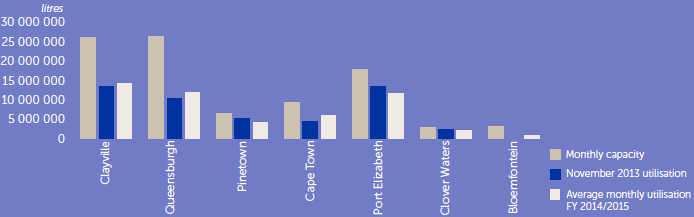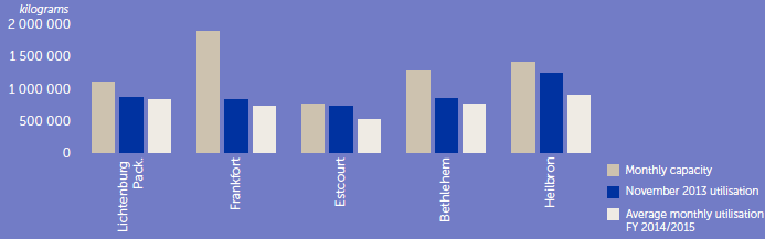 Sales growth is only possible if the manufacturing capacity exists to meet the higher volumes of production required. The ability of the organisation to manage available capacities pro-actively, is critical in order to meet unexpected demand and to reduce capacity as required in order to keep lowering unit production costs on a continuous basis. As a measure of Clover’s ability to continue producing income and other flows, it is important that the capacity utilisation per product group is within best practise. As milk intake is seasonal, with increased milk intake between August and January in any given year, certain factories are working at full capacity in the seasonal peak cycle, where after production reduces substantially in the off season. Therefore Clover’s capacity in the seasonal peak determines limits for increased milk intake. As our business is highly seasonal for some products, the average value as well as the peak (November) value have been considered. For a seasonal product, the peak value is more illustrative.