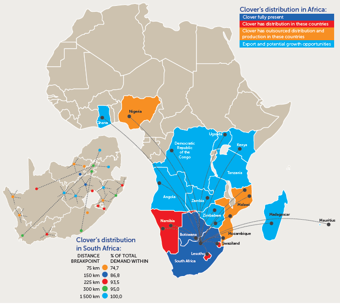 Stores receive direct deliveries of Clover products between two and five times per week, depending on sales volumes. Clover has over 600 delivery vehicles which deliver stock to over 14 550 delivery points. Over 800 SKU (stock keeping units) are stored, picked, delivered and merchandised in Clover’s distribution network. More than 50% of all refrigerated dairy and processed meat products delivered to stores are being supplied through the Clover Distribution Network.