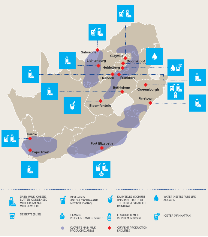 Once the raw milk has passed all quality tests, the milk is processed at Clover’s 16 production facilities across South Africa and in selected African countries. The type of products produced include fresh milk, UHT milk, flavoured milk, as well as concentrated type products such as cheese, butter and milk powder. For the manufacturing of beverage products, the base ingredient, generally in concentrate form, is procured from carefully selected suppliers who are contracted to ensure consistent and high quality materials are used in the manufacturing process. The concentrate is mixed with good quality water to manufacture the final product such as Krush Juice and Tropika. In bottling water, water is extracted from a selected natural ground water source, upon which vigorous tests are routinely performed to ensure ongoing quality and safety of the water source. During the period under review, the group acquired the UHT Milk (Epping plant) and Yoghurt (Bloemfontein) factories from Dairybelle as well as Clover MilkyWay, formerly known as Nkunzi MilkyWay, which is situated in Silverton, Pretoria.