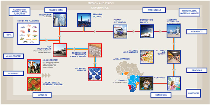 Once stakeholders are identified, management decides through consultation with the various stakeholder groups how to further engage with each constituency. This process forms part of the Group’s risk management framework. As a result of Clover’s diverse business model, Clover interacts through a wide range of functions within the business with various stakeholder groupings on an ongoing basis. The Clover stakeholders that have been identified are all stakeholder groups that can materially influence the attainment of Clover’s strategic objectives, but also more specifically it is those groups, individuals or entities, who can be affected by the actions and operations of Clover or, on the contrary, whose operations can materially impact on Clover’s operations. Amongst all the major stakeholder groupings videntified, Clover has a distinct criterion for its strategic stakeholder partners whose relationships are required for the Group to attain its future strategic objectives.