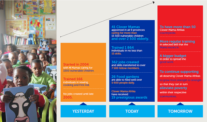 Clover Mama Afrika has positioned itself as a successful, award winning example of a sustainable and effective CSI project, which is making a real difference in the lives of many needy South Africans.
