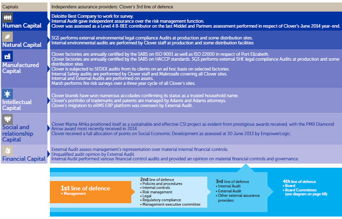 Although King III requires that sustainability reporting be independently assured, the Committee has obtained partial assurance over the six capitals to the extent disclosed in the combined assurance framework as reflected in the table on the right. It is the Group’s intention to enhance qualitative and quantitative information as systems are progressively bedded down. All material risks considering the sustainability of Clover’s business model and in complying with the requirements of Regulation 43 of the Companies Act, as well as King III are incorporated into Clover’s risk universe and are monitored under Clover’s risk management process as described more comprehensively under the Governance section of the Integrated Report.