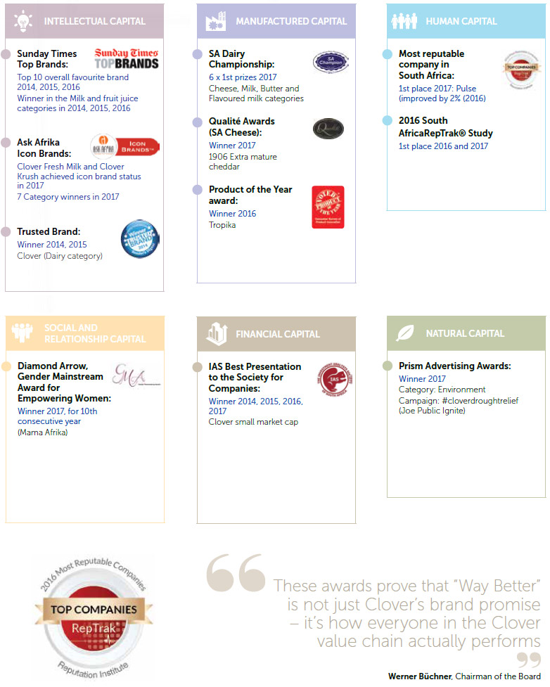 Some 112 years later Clover’s shareholders took a giant visionary stride into the future by listing on the JSE on 14 December 2010 to raise the capital needed to grow a way better Clover upon its fundamental dairy base. Clover has since embarked on a value creation journey that in 2017 saw Clover being acclaimed as the most reputable company for a second time in the 2017 South Africa RepTrak® study. Since then, Clover won many other awards as depicted here.