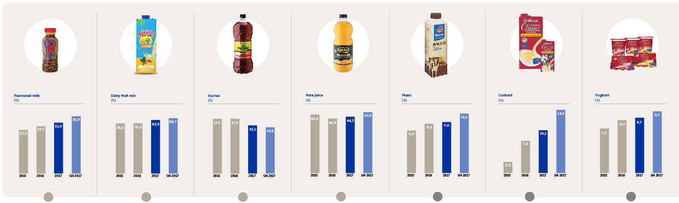 Clover grew its market share from 79,0% to 83,9% through its popular “Tropika” and “Danao” brands. Given higher pricing and the adverse weather conditions during the festive season, volumes decreased 3,8% in this category. The launch of Clover’s new Tropika Slenda with less sugar has been very well received in the market.