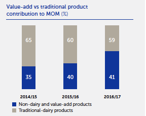 Since listing in 2010, we have been working towards diversifying Clover’s business away from low-margin, commoditised bulk dairy products, focusing on higher margin value-added branded food and beverages to improve operating margins across the portfolio. In contrast, profit on traditional dairy products are typically driven by volumes and this would apply to fresh milk, ultra-high temperature milk, ultra-pasteurised milk, skim milk powder, whole milk and bulk cream.